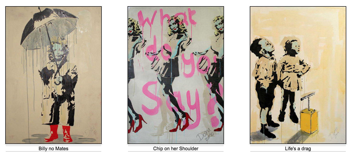Artist Dom Pattinson smelts carefree, audacious attitudes and sassiness with Street Art influences to produce his own style. As Urban Art is fast becoming popular, the marriage between Street Art and universally digestible fine art is blurred with Dom’s original thought and application of mixed media on canvas and paper. His art transcends the exponential, mode-de-jour of the Graffiti Art Movement of recent years because his pieces inherently omit the bounds that street art in public areas impose; his art is produced on traditional material and is found hanging on walls in homes, galleries and private collections. It is this highly personal approach that sets him apart.