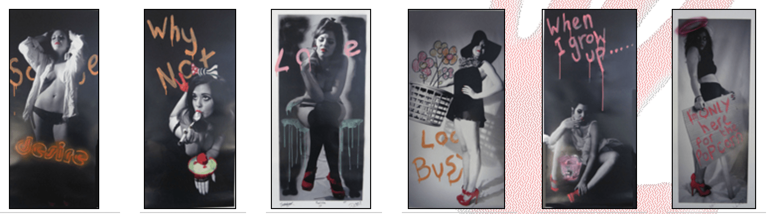 Dom creates sassy, provocative imagery that connects with everyone on different levels – a fundamental pillar of Urban Art. His work is often comprised of repeated stencil patterns using a pastel palette contrasted with bold black, interspersed with bursts of flavorsome color. Experimentation with printmaking, stenciling, spray-painting, collage and acrylics help him to capture his muse, which is nothing more than everyday life